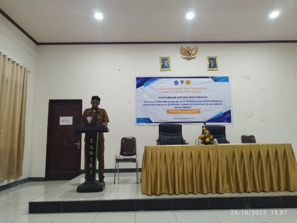 Ambon, 28 Oktober 2025 – Prodi Fisika, Fakultas Sains dan Teknologi, Universitas Pattimura melaksanakan kegiatan Pengabdian kepada Masyarakat (PkM) di Negeri Tawiri, Kecamatan Teluk Ambon, Kota Ambon, yang berlangsung dari tanggal 23–30 Oktober 2025. Kegiatan ini mengusung tema “Mitigasi Bencana Alam melalui Pendekatan STEAM Berbasis Geosains Inovatif”, sebagai bentuk kontribusi nyata perguruan tinggi dalam meningkatkan literasi kebencanaan di masyarakat pesisir.